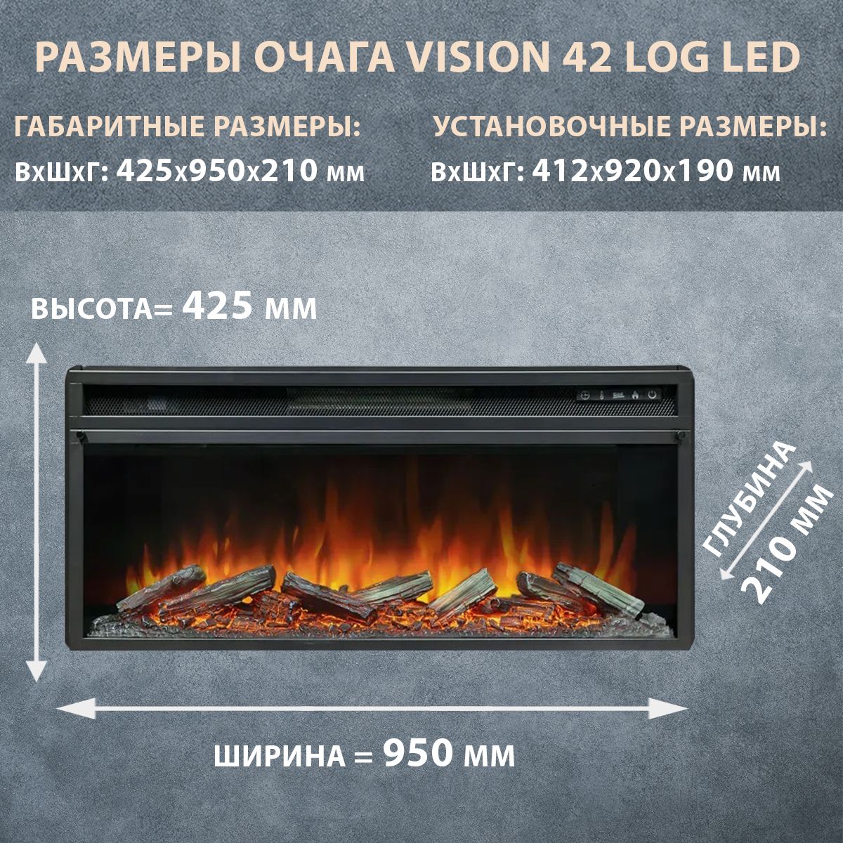 Линейный электроочаг Vision 42 LOG LED – это современный широкоформатный электрический очаг. Его размер составляет 425х950х210 мм, а встраиваемые размеры: 412х920х190 мм. Он может устанавливаться как отдельно без каминного портала, также встраиваться в нишу или каминный портал.