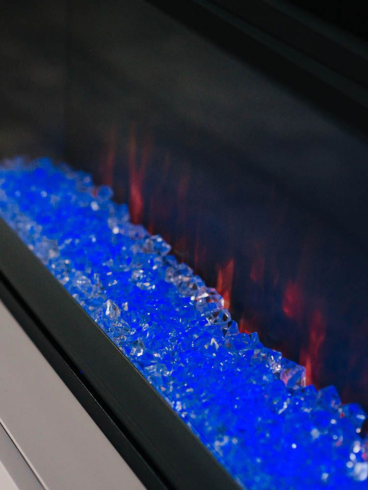 Декоративное топливо укладывается под стекло на выбор: разноцветная галька или прозрачные кристаллы. Подсветку кристаллов и яркость пламени можно регулировать – доступно 4 возможных варианта. Модель дополнена звуковой имитацией потрескивания дров.
