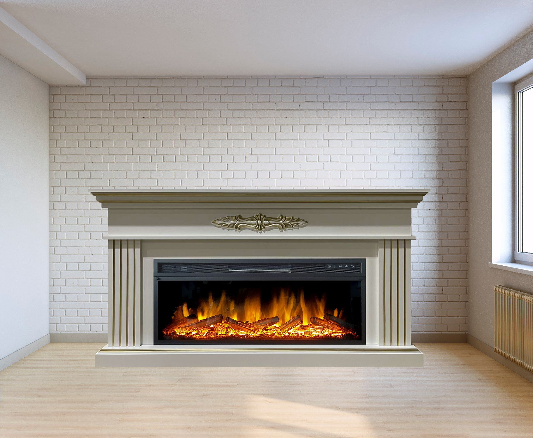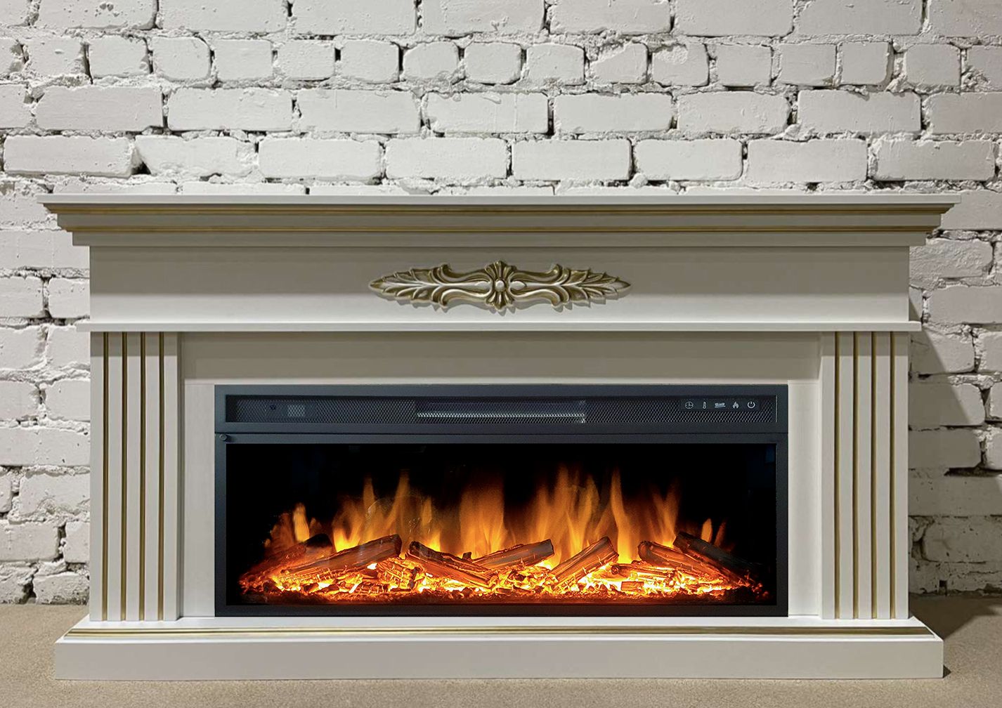 Линейный электрокамин Bergamo WTG с очагом Vision 42 LOG LED выполнен в современном минималистском стиле, поэтому он идеально подойдёт под обстановку хай-тек, в которой будет привлекать внимание своими прямыми линиями и лаконичными формами. Изготовлен из МДФ и экошпона в белом цвете с нанесением золотой патины.