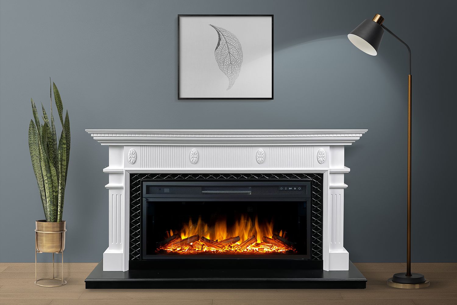 Линейный электрокамин Carlyle белый с черным с очагом Vision 42 LOG LED