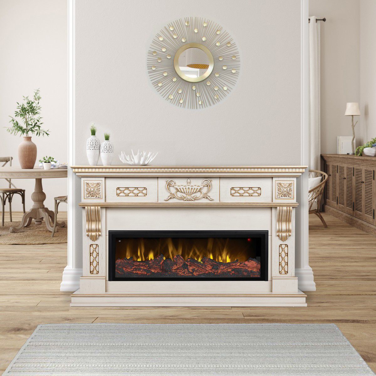 Укомплектован линейным электроочагом Beverly 1000, который превосходно подходит для создания атмосферы тепла и уюта в вашем доме. Подберите наиболее комфортный режим яркости пламени, включите звуковой эффект потрескивания дров и погрузитесь в магию огня. В очаге визуальный эффект горящего огня создается с помощью проекционной LED-технологии, имитация пламени, дрова. Присутствует звуковой эффект потрескивания дров. В электрокамине предусмотрена функция регулировки яркости пламени. Комплектуется пультом дистанционного управления.
