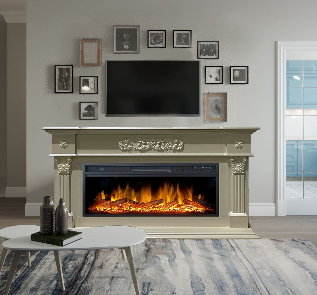 Портал декоративного камина укомплектован широкоформатным линейным электроочагом Vision 42 LOG LED. Главная особенность линейного электрического очага Vision 42 LOG LED – проекционная технология пламени со светодиодной подсветкой. Декоративное топливо: дрова. Имитация огня в очаге создается с помощью специальной подсветки, а ее эффект усиливается благодаря «тлеющим» поленьям и подсветке боковых стенок. Это добавляет ему элегантности и утонченности. Такой декоративный элемент сделает любое помещение более современным и стильным.