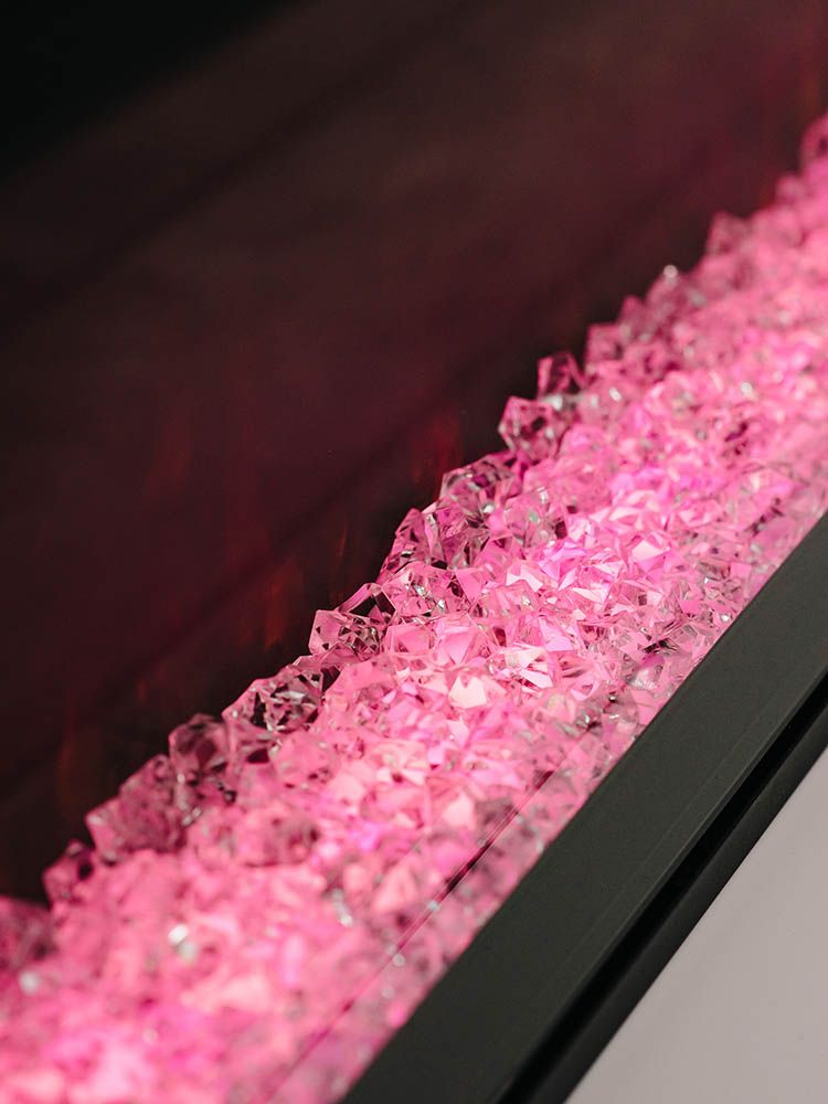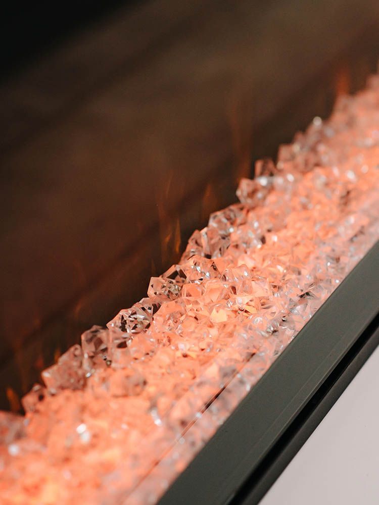 Декоративное топливо укладывается под стекло на выбор: разноцветная галька или прозрачные кристаллы. Подсветку кристаллов и яркость пламени можно регулировать – доступно 4 возможных варианта. Модель дополнена звуковой имитацией потрескивания дров.