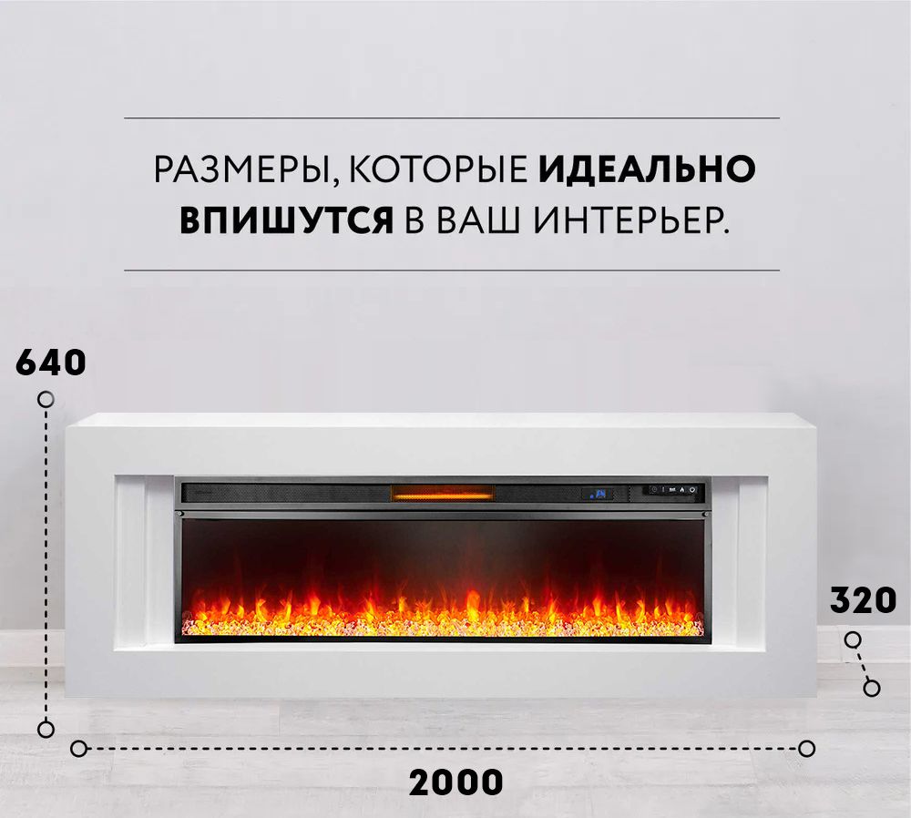 Линейный электрокамин Line WT с очагом Vision 60 LED – это современный широкоформатный электрический камин. Его размер составляет: 640х2000х320 мм. Изготовлен из высококачественного МДФ в белом цвете.