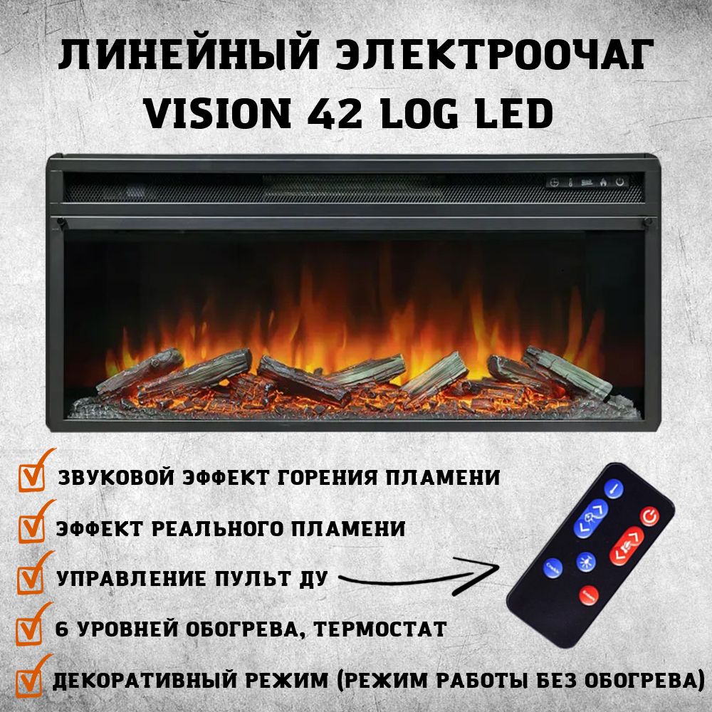 Работа очага возможна как в декоративном режиме, так и в режиме обогрева. Мощность обогрева до 1,5 кВт с 6 уровнями регулировки работает автономно от эффекта пламени, поэтому камин можно использовать в течение всего года. Чувствительный термостат поддерживает комфортную температуру воздуха с высокой точностью. Управлять работой электроочага Vision 42 LOG LED можно с помощью пульта ДУ или кнопок, расположенных на фронтальной панели очага.