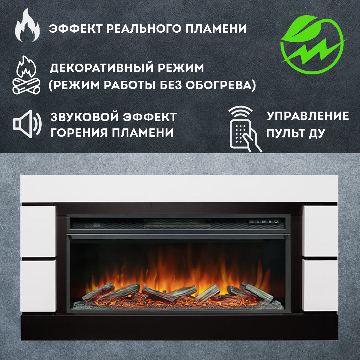 - Управление: пульт ДУ или кнопки на фронтальной панели очага