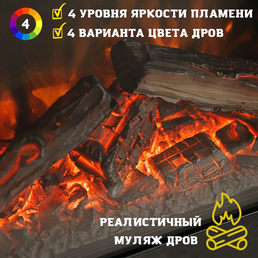 Имитация огня в очаге создается с помощью специальной подсветки, а ее эффект усиливается благодаря «тлеющим» поленьям и подсветке боковых стенок. Это добавляет ему элегантности и утонченности. Такой декоративный элемент сделает любое помещение более современным и стильным. Реалистичный муляж дров и звуковая имитация потрескивания дров создают иллюзию натурального дровяного камина. Яркость пламени можно регулировать – доступно 4 возможных варианта.