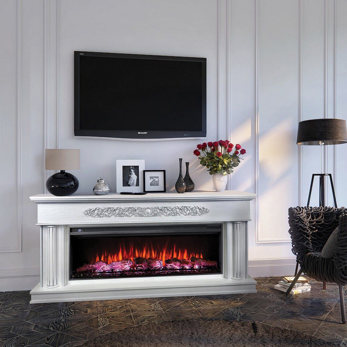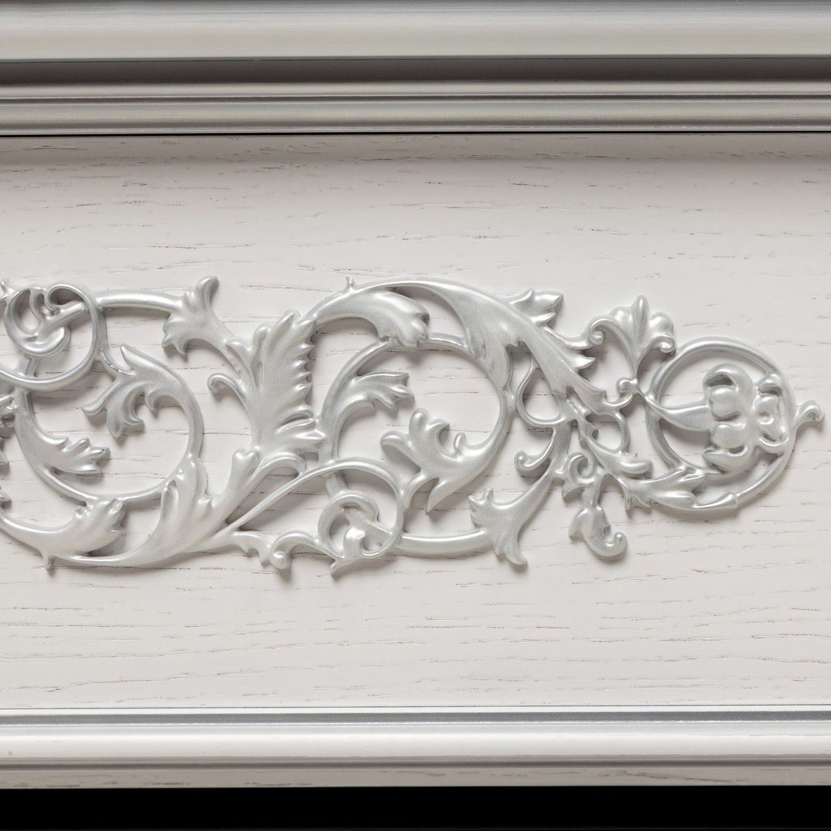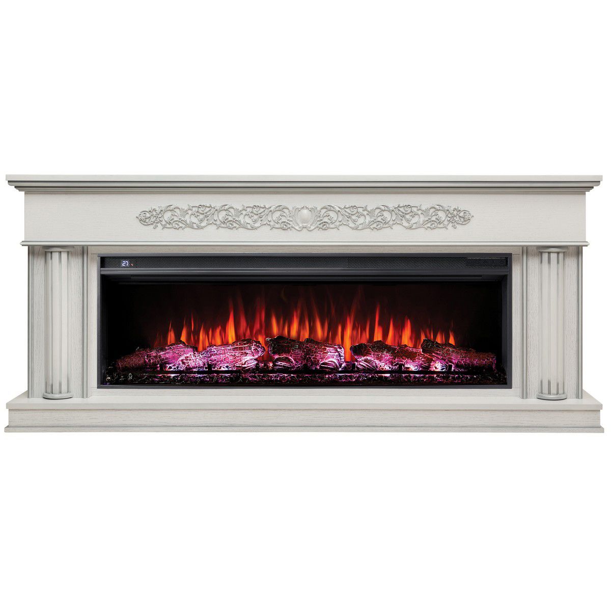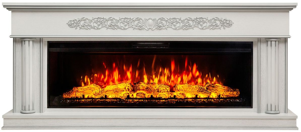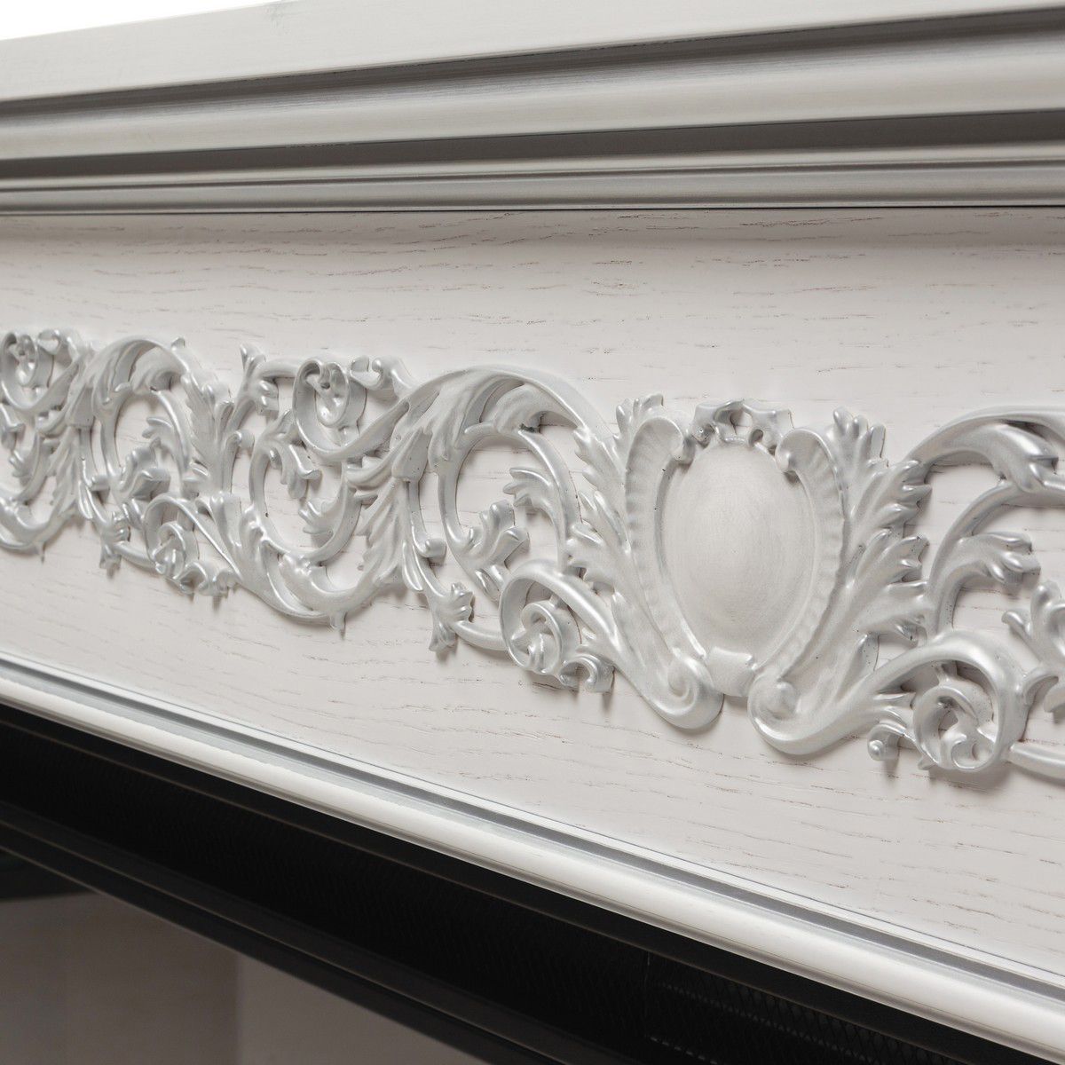 Линейный электрокамин Атлантида WT Joker 52 выполнен из износостойкого МДФ в цвете белый дуб с патиной серебро - классический орнамент позволяет подчеркнуть яркое пламя во встроенном очаге.