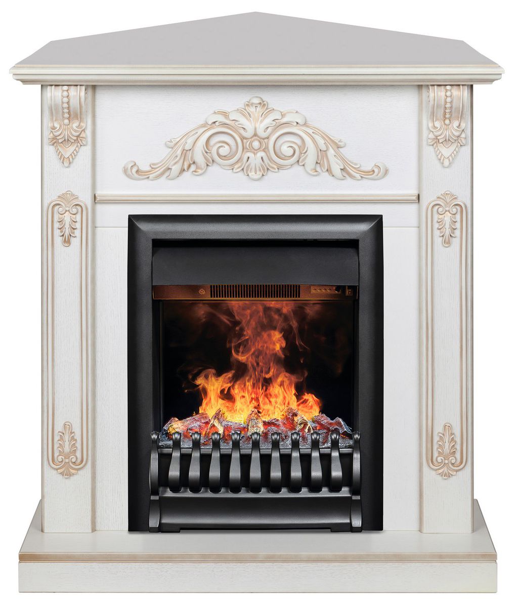 Угловой электрокамин Anita WT с очагом 3D Oregan в цвете дуб белый с золотой патиной - это элегантное решение для классических интерьеров. Выполнен из МДФ и шпона.