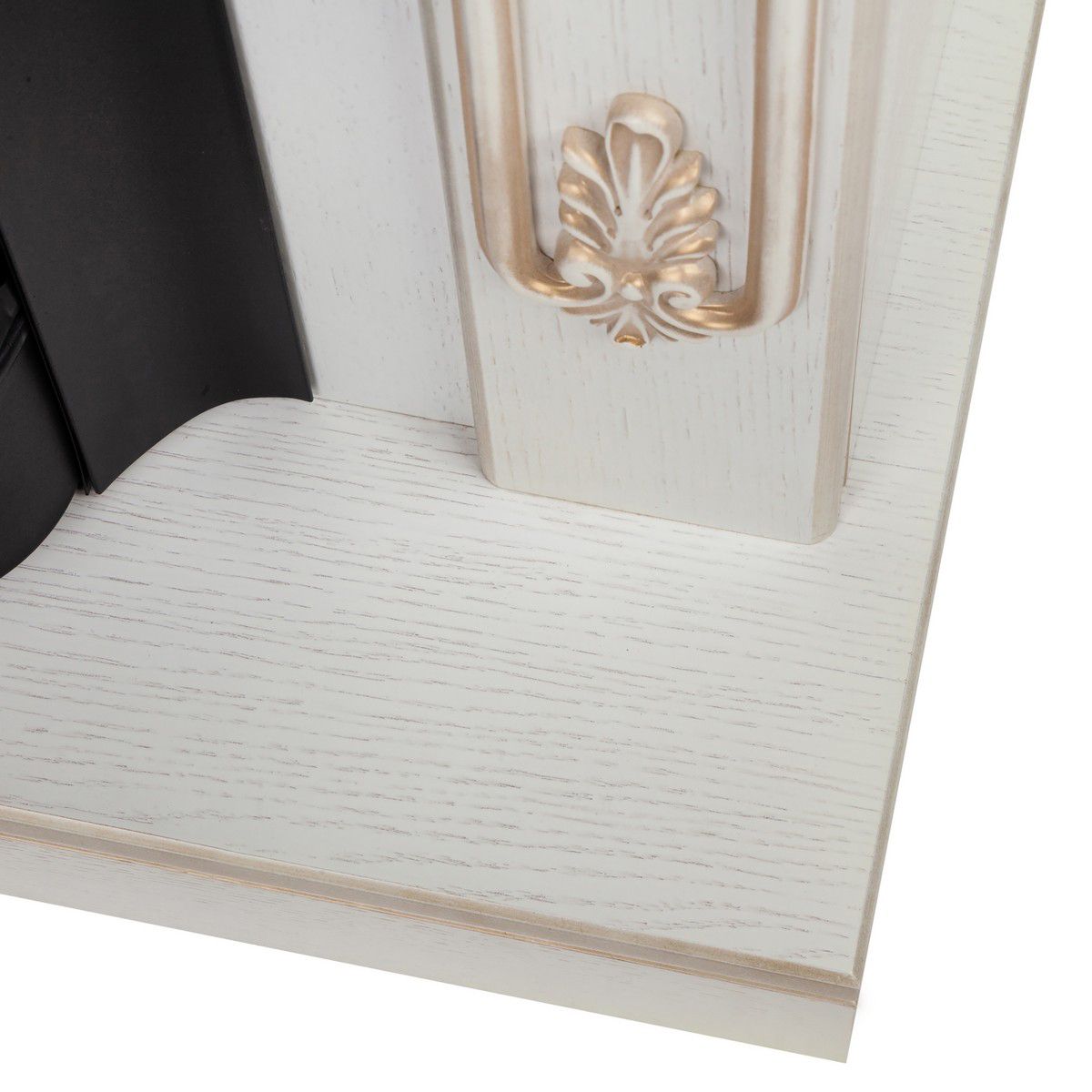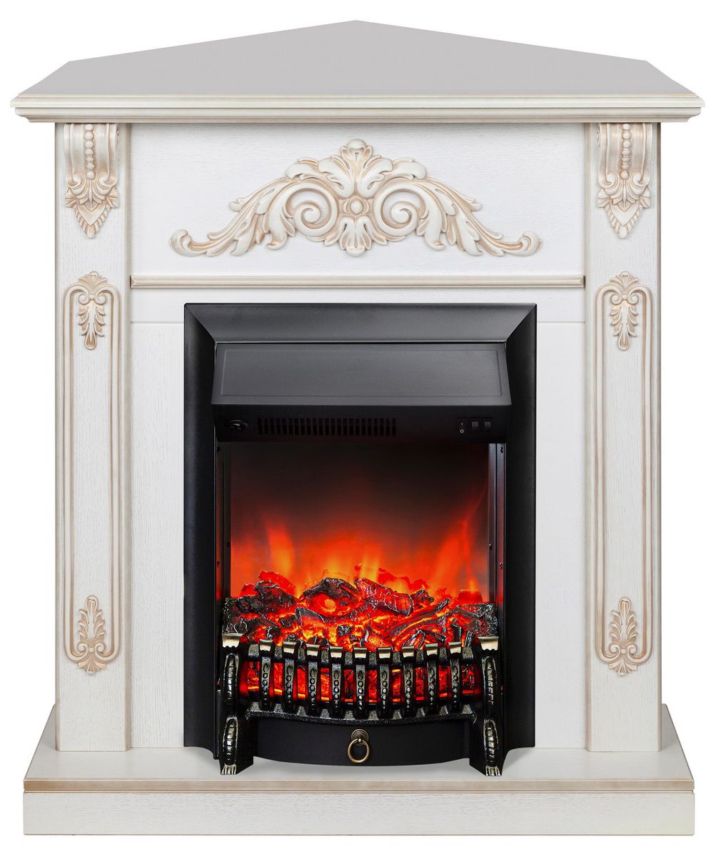 Угловой электрокамин Anita WT с очагом Fobos в цвете дуб белый с золотой патиной. Изготовлен из МДФ и шпона. Элегантное решение для классических интерьеров.