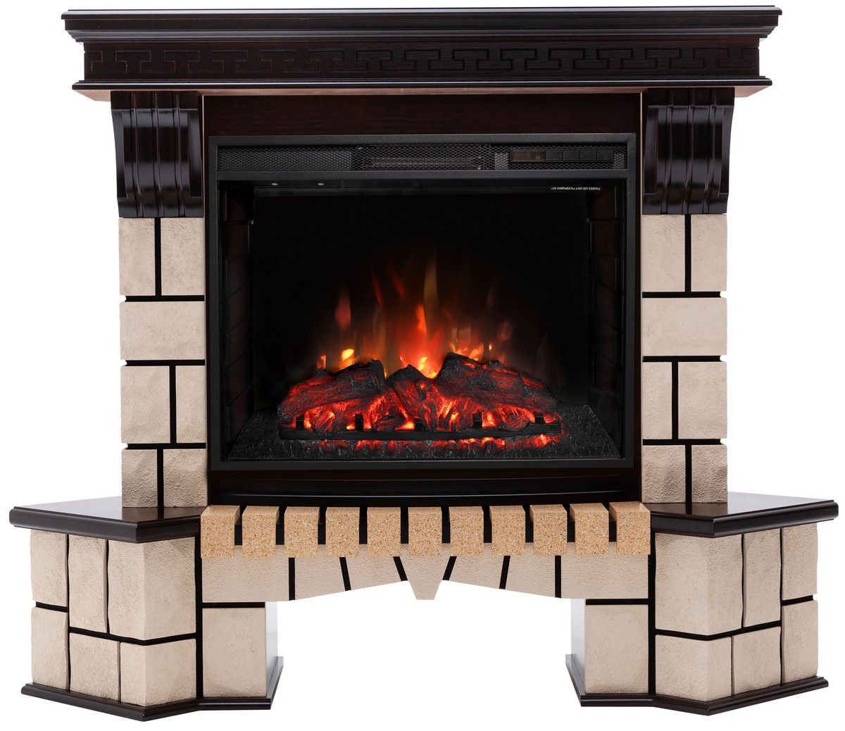 Портал укомплектован широким электроочагом Sparta 25.5 LED с великолепным разноцветным пламенем (3 цвета пламени), пламя в очаге смотрится выразительно и эффектно, а муляж дров и кирпичная кладка создают полное сходство с натуральным очагом. Эффект пламени притягивает к себе внимание с первых секунд. В очаге реализован один из самых совершенных способов визуализации пламени 2D на сегодняшний день. Визуальный эффект горящего огня создается с помощью проекционной LED-технологии.