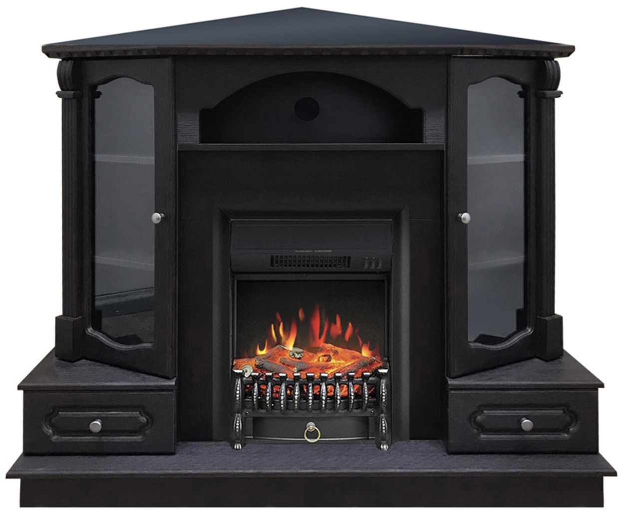 Угловой электрокамин Вилс BL с очагом Fobos изготовлен из МДФ и ЛДСП, много-функциональный дизайн, строгий ретростиль. Комплектация ящиками полного выдвижения по обе стороны портала. Открывающиеся рамочные фасады с прозрачным стеклом на петлях с доводчиком. Полки ЛДСП. Заглушка под провода. Инструкция по сборке.